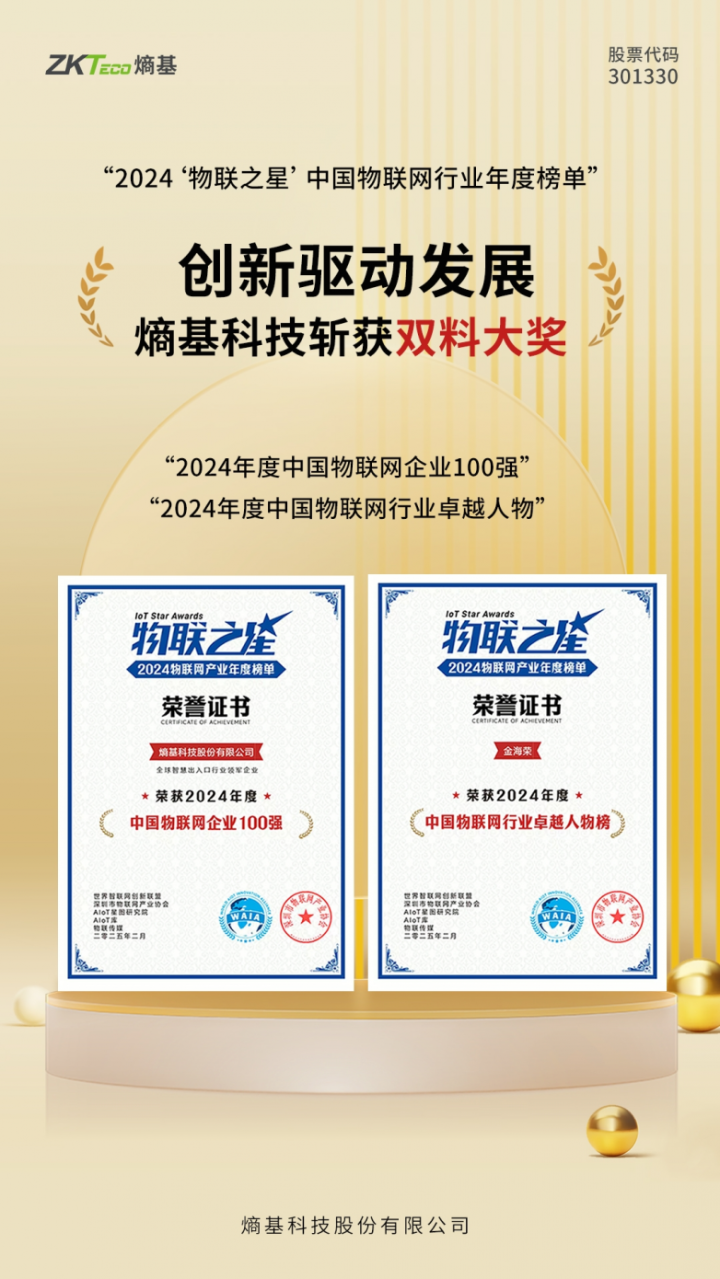 近日,备受瞩目的“2024‘物联之星’中国物联网行业年度榜单”正式揭晓,该榜单被誉为物联网行业的“奥斯卡奖”。凭借在物联网领域的深厚积累与出色表现,熵基科技荣耀登榜,荣获“2024年度中国物联网企业100强”称号,同时,熵基科技股份有限公司法定代表人、董事兼总经理金海荣先生也荣获“2024年度中国物联网行业卓越人物”殊荣。